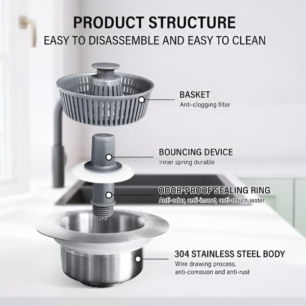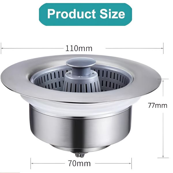 Αυτή η λύση “όλα σε ένα” λειτουργεί ως σουρωτήρι, πώμα και φίλτρο οσμών – διατηρώντας τον νεροχύτη σας καθαρό, στεγνό και χωρίς οσμές.
