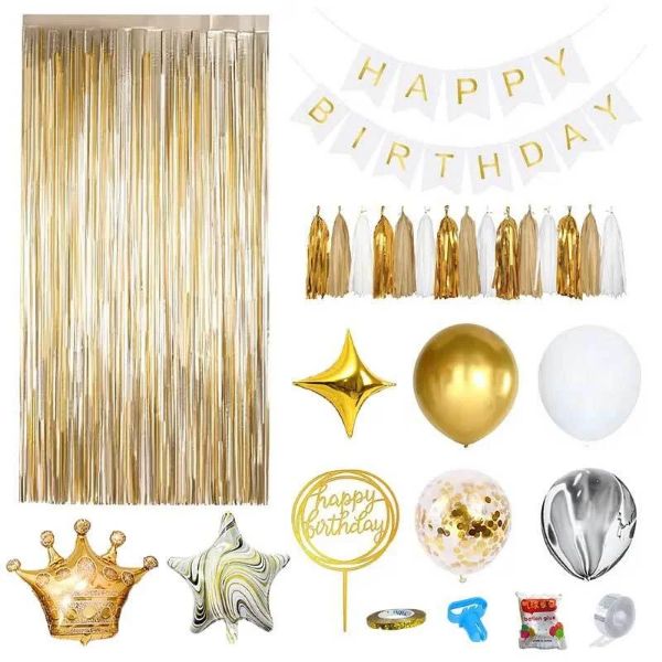 60 μπαλόνια διαφόρων χρωμάτων. 1x μπαλόνι σε σχήμα κορώνας. 2x μπαλόνια σε σχήμα αστεριού με πέντε αιχμές. 2x μπαλόνια σε σχήμα αστεριού με τέσσερις αιχμές. 1x κουρτίνα από αστραφτερές κορδέλες. 1x πανό Happy Birthday. 5x σετ πολύχρωμες διακοσμητικές φούντες. 1x διακόσμηση τούρτας Happy Birthday. Διακοσμητική κορδέλα, αξεσουάρ δεσίματος μπαλονιών, κόλλα και ταινία στερέωσης μπαλονιών.